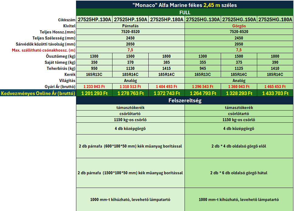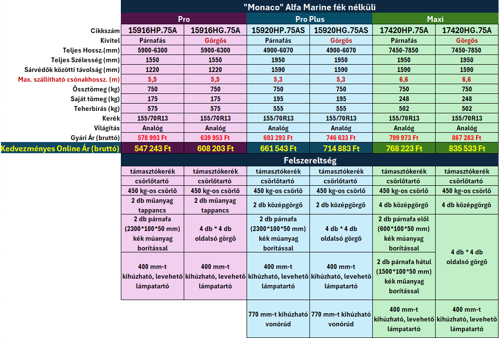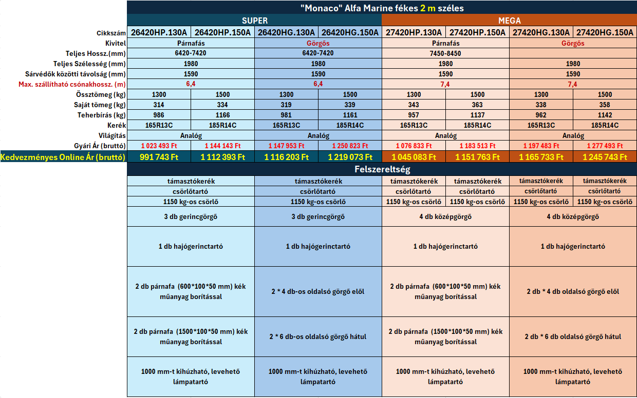 A termékcsalád elérhető párnafás és görgős kivitelben, így optimálisan illeszkedik különböző hajó- és csónaktípusokhoz. A párnafás megoldás egyenletes alátámasztást biztosít, míg a görgős rendszer megkönnyíti a vízre bocsátást és a felhúzást. A nagyobb méreteknek köszönhetően a "Monaco" modellek 5,5 métertől egészen 7,5 méter testű csónakok, hajók szállítására is alkalmasak.