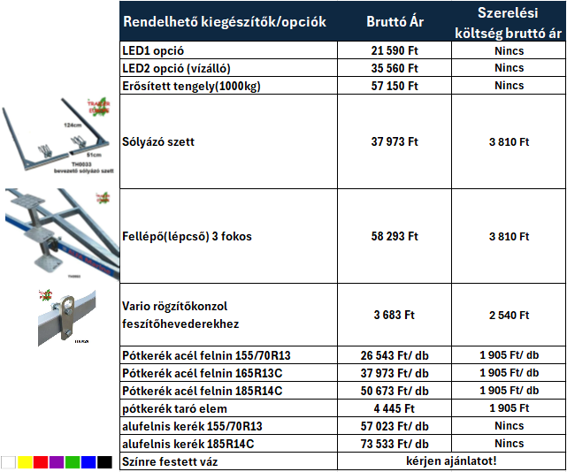 A termékcsaládhoz számos kiegészítő érhető el felár ellenében, például extra görgők, orrtámaszok, csörlőoszlopok, világítási megoldások vagy zárható vonófej. Ezek a tartozékok tovább növelik a biztonságot, a kényelmet és az utánfutó testreszabhatóságát.
