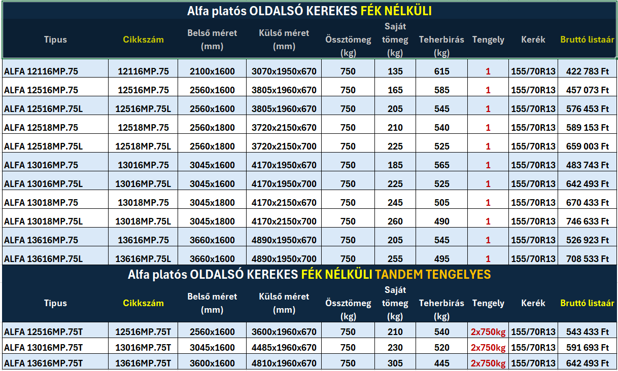 Alfa platós oldalsó kerekes utánfutók