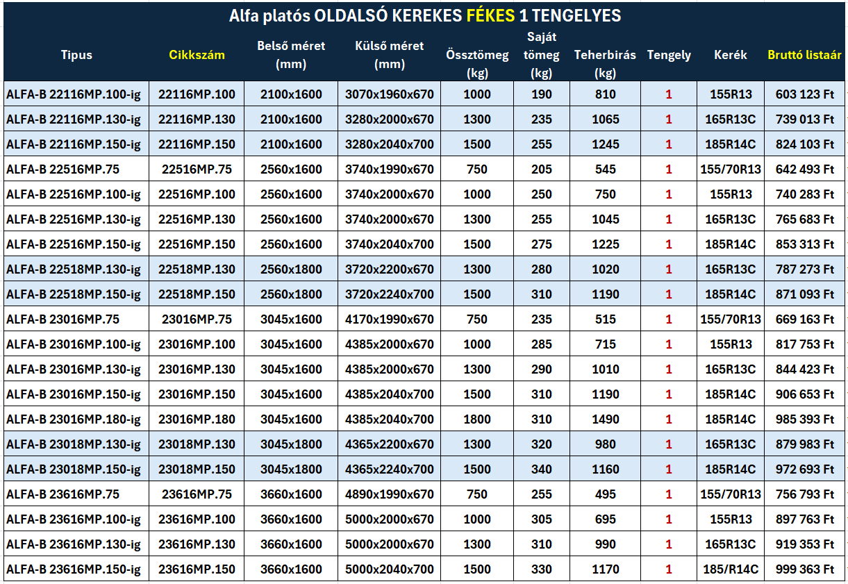 Alfa platós OLDALSÓ KEREKES FÉKES 1 TENGELYES