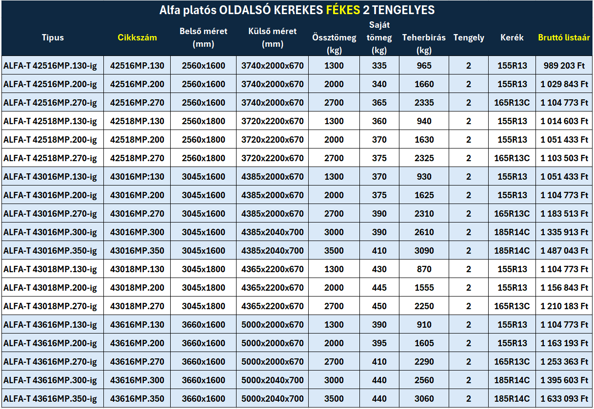 Alfa platós OLDALSÓ KEREKES FÉKES 2 TENGELYES