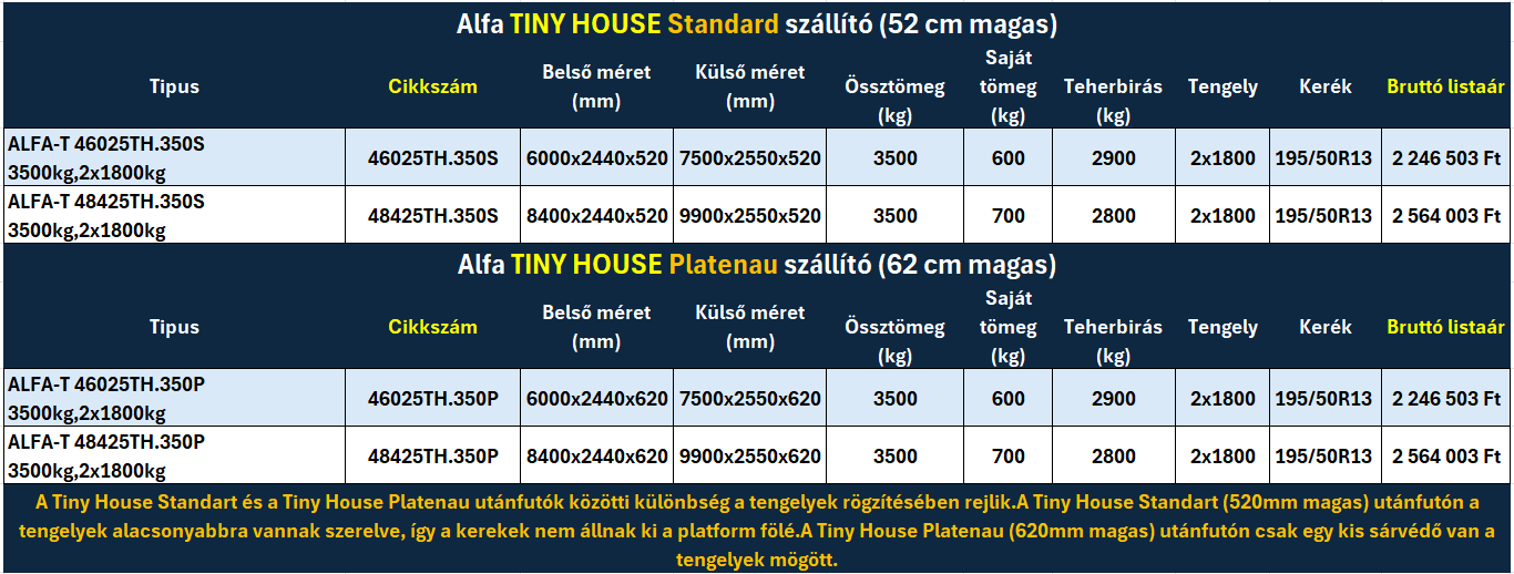 A Tiny House Standart és a Tiny House Platenau utánfutók közötti különbség a tengelyek rögzítésében rejlik.A Tiny House Standart (520mm magas) utánfutón a tengelyek alacsonyabbra vannak szerelve, így a kerekek nem állnak ki a platform fölé.A Tiny House Platenau (620mm magas) utánfutón csak egy kis sárvédő van a tengelyek mögött.