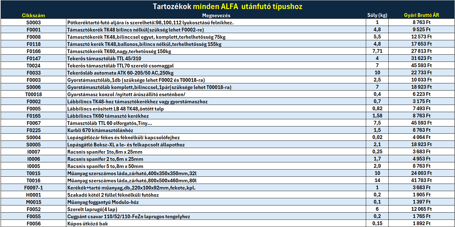 Univerzális tartozékok minden Alfa utánfutó típushoz